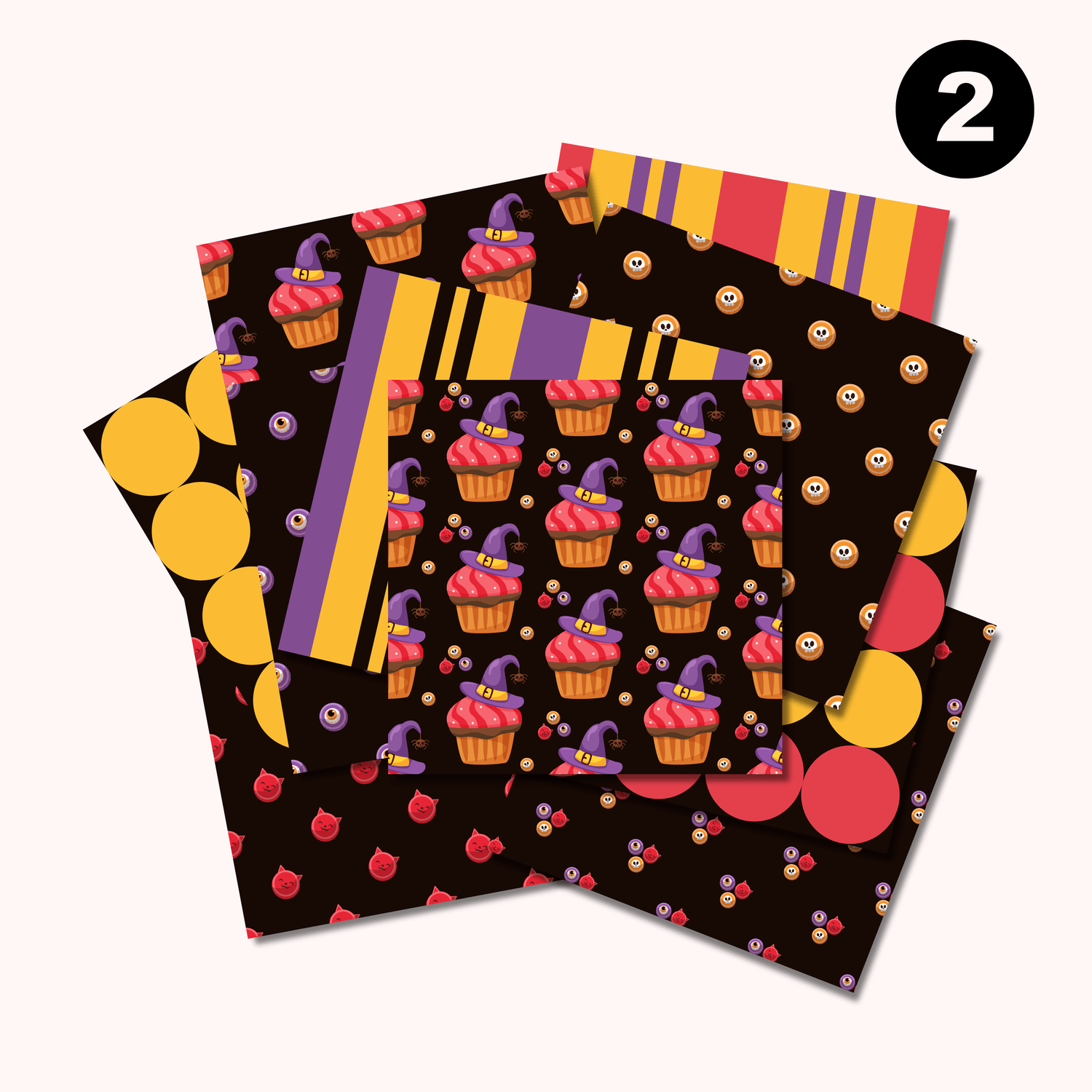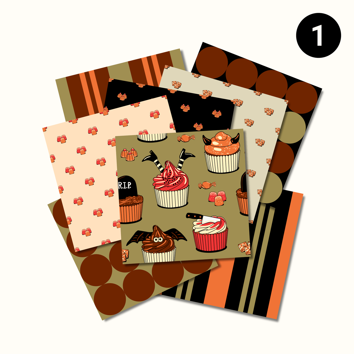 With their mix of costumed cupcakes, chocolate candies, and matching striped and polka-dot backgrounds, theyβre perfect for building full seamless pattern sets or coordinating Halloween collections.